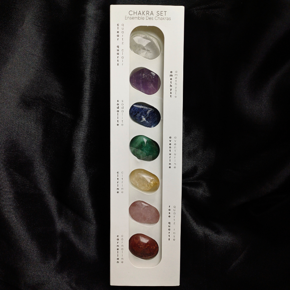 Chakrojen kanssa työskentely on yhä suositumpaa, ja sitä käytetäänkin muun muassa erilaisten tunnelukkojen ja fyysisten vaivojen itsehoidossa. Jokainen chakra on yhteydessä erilaisiin fyysisiin, emotionaalisiin, henkisiin hyvinvoinnin sekä elämän osa-alueisiin, ja erilaisten kivien uskotaan resonoivan ja tukevan jokaisen chakran energiaa. Tässä chakra-kristallisetissä on seitsemälle chakralle oma kristalli.